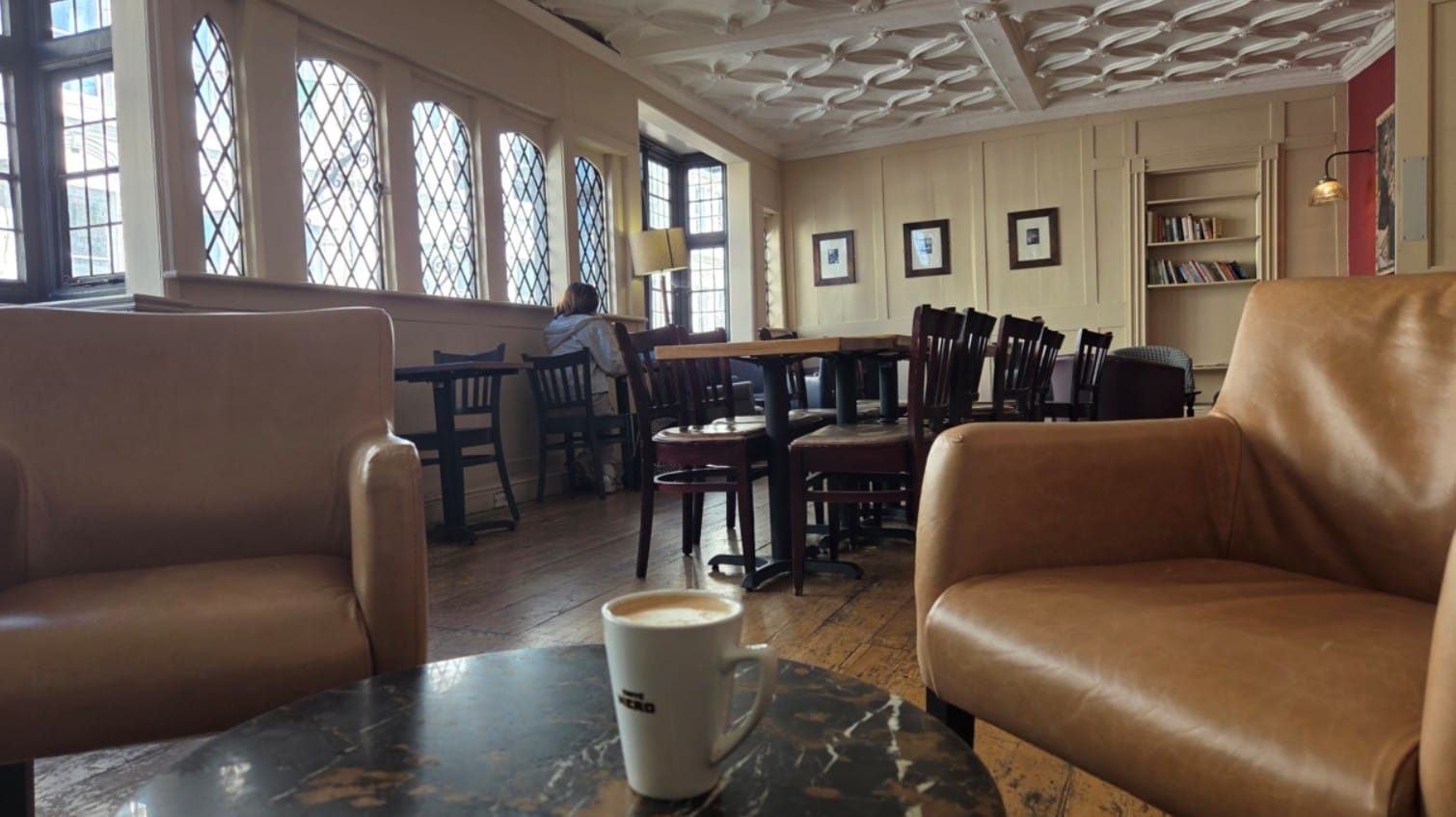 A pause for coffee at Caffe Nero. It’s an ancient building – upstairs is the Queen Elizabeth’s Guest Chamber. Here, it is said, Elizabeth (the first) met the Duke of Alençon, the person she came closest to marrying. He was twenty-four, she forty-six. It is a quiet haven. One senses that they have only just departed, leaving their half-drunk lattes behind them.