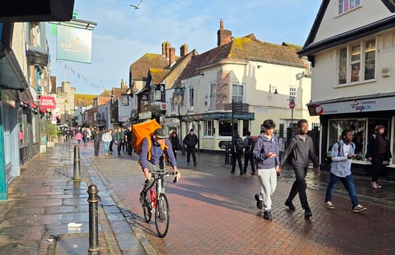 Crossing the pedestrianised High Street, which slices through the circle of the walled city. People walk along it at speed, on their way to their various workplaces.