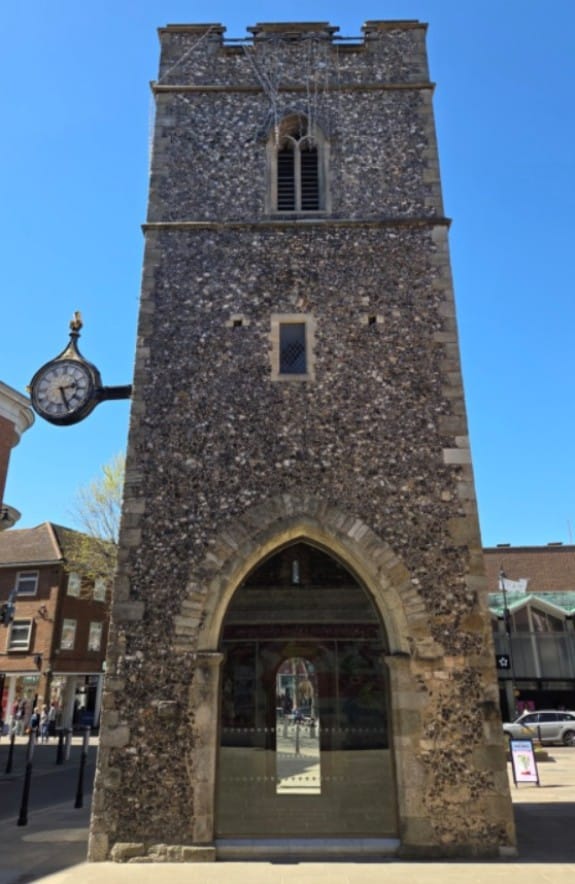 At the top end of the street, the church where Marlowe was baptised. Only the tower of St George’s survives. Here was the epicentre of the 1942 Baedeker raids on the city, German bombers off-loading on cultural places identified in the famous tourist guide. Here the city of old disappeared; the modern stores of Whitefriars fill the gap, reducing Canterbury to anywhere.
